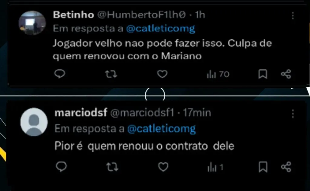 “Eu to incrédulo que atleticanos acharam penalti EU ACHO O MARIANO RIDÍCULO MAS O CARA SE JOGOU EM CIMA DELE UMA LOUCURA UM SURTO COLETIVO O mariano é tao horroroso que ele fez um penalti que nao existiu e a galera pra ficar feliz ta concordando com esse absurdo”