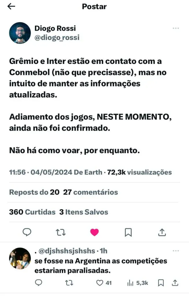 A situação no Sul piorou bastante devido às fortes chuvas. Mais pontos de Porto Alegre e demais regiões foram atingidas. Diante dessa situação, o jornalista Diego Rossi trouxe uma atualização envolvendo o Internacional e o Grêmio.