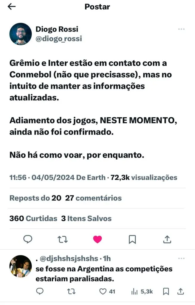 Ainda não foi confirmado o adiamento dos dois jogos, porém, neste momento, voar é impossível. Nas próximas horas, haverá mais atualizações sobre a situação e se as partidas serão mantidas. Inclusive, Inter e Grêmio estão arrecadando e ajudando as pessoas que foram atingidas pela catástrofe.