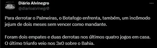 “Os últimos três jogos do Botafogo em seu território, que costumava ser um trunfo, resultaram em dois empates e uma derrota. A equipe venceu o Fluminense fora de casa, no Maracanã, e o América-MG também fora. Em contrapartida, empatou com Goiás e Athletico-PR, além de ter sido derrotado pelo Cuiabá”, disse o comentarista.