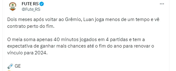 Vale lembrar que o contrato do atleta com o Imortal vai até 31 de dezembro deste ano e ainda não se sabe se o presidente Alberto Guerra vai optar por renovar seu vínculo. Ainda assim, segundo o Globo Esporte, Luan vive a expectativa de ganhar mais oportunidades para provar que a diretoria do Tricolor do Rio Grande do Sul deve optar por continuar com ele em seu elenco para o ano que vem.
