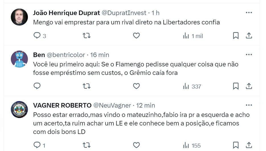 “O Gremio também demonstrou interesse em Matheuzinho, mas acenou com a vontade de ter o lateral por empréstimo. O Flamengo prioriza venda, que é a proposta do Corinthians, clube inclusive que o jogador dá prioridade desde o início da janela”, escreveu o repórter do SBT no X.
