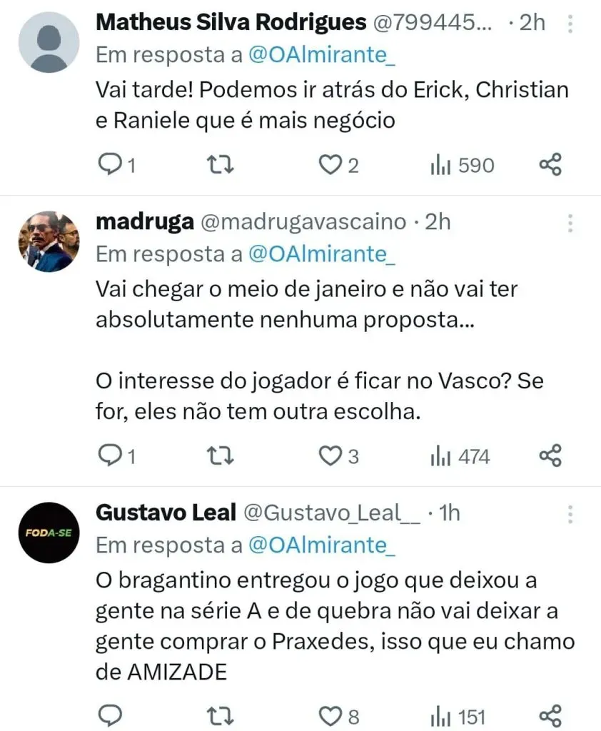 Além disso, um fator que pode fazer o Bragantino mudar de ideia é o fato de o atual diretor de futebol do Vasco, Alexandre Mattos ter uma boa relação com Diego Cerri, diretor do Bragantino.