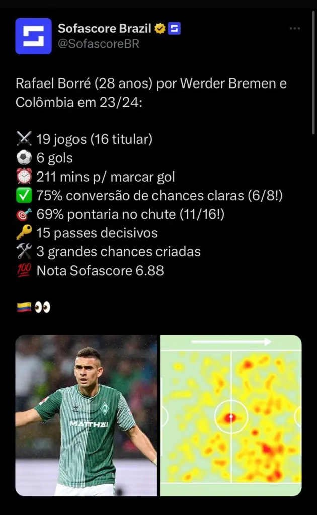 Uma das principais cartadas do Inter, é o atacante Rafael Borré, de 28 anos, atualmente no Werder Bremen, da Alemanha, mas que está emprestado ao Frankfurt, também do futebol alemão.