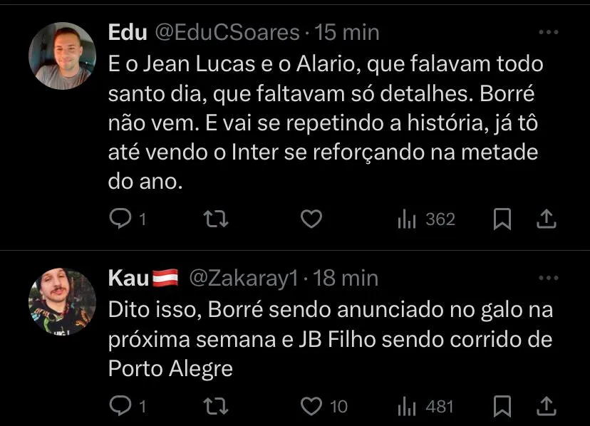 Apesar do interesse do Inter, segundo informado pelo UOL, o jogador pode estar de malas prontas para o Atlético Mineiro. Isso se deu enquanto o staff colorado viu o time mineiro se aproximar de Borré.