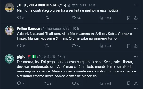 Assim, ainda segundo o jornalista, existe boa chance de êxito no recurso. Com isso, caso o pedido seja acatado, o Coritiba já admite avaliar a situação e a possibilidade de reintegração imediata, o que o transformaria em uma “reforço” para 2024.