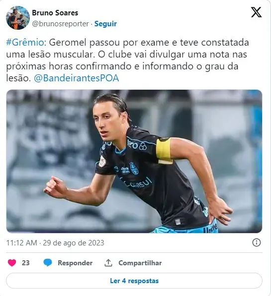 Nesta terça-feira (29), o departamento médico do Grêmio atualizou a situação e, segundo apuração do jornalista Bruno Soares, da Bandeirantes, o xerife Tricolor foi diagnosticado com uma lesão muscular.