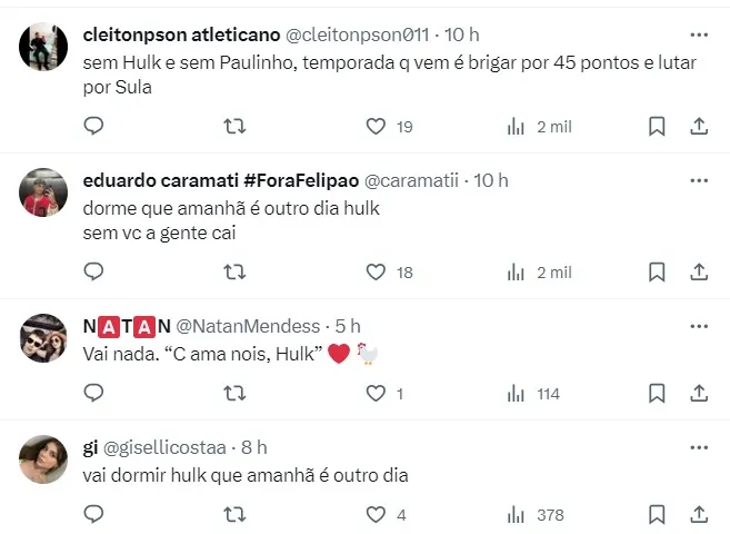 O que mais chamou a atenção foi Hulk, o jogador que foi expulso por reclamação, deu uma declaração polêmica que deixou os torcedores do Galo preocupados com o futuro do camisa 7 no Clube.