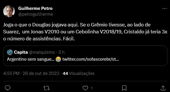 “Na vez passada, eu dei entrevista dizendo que não iria comemorar na Arena por respeito à minha história. Agora, na saída, teve torcedores pedindo para eu voltar, me aplaudindo e até dei a camisa para um torcedor que pediu. Comecei na base, subi, saí por cima, tenho um respeito máximo pelo Grêmio. Eu estou com a cabeça no Flamengo e tenho mais três anos de contrato”, disse Everton Cebolinha na zona mista.