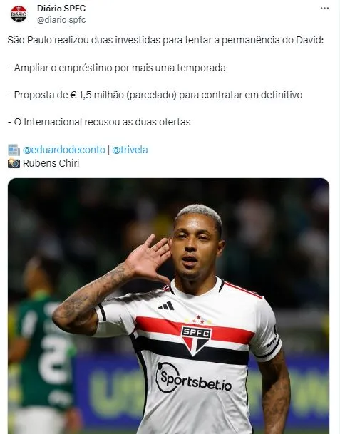 Segundo apuração do jornalista, o clube paulista oferece 1,5 milhão de euros, cerca de R$ 8 milhões para contratar David. O São Paulo já tentou um novo empréstimo, mas agora trabalha para a cartada definitiva.