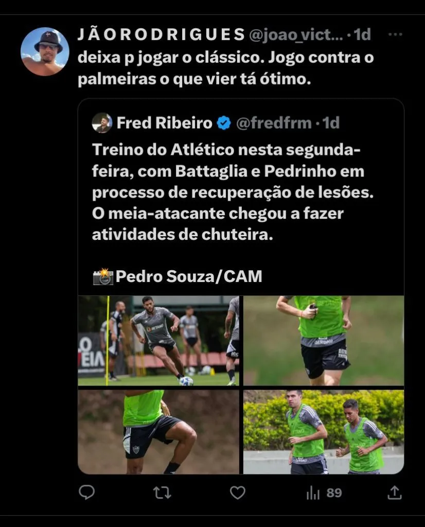 O Atlético foca totalmente em sua recuperação no Brasileirão após a última derrota em casa para o Coritiba , no próximo jogo na quinta-feira (19), às 19h, contra o Palmeiras, no Allianz Parque. O time mineiro teve o tempo da paralisação da Data FIFA para se preparar contra o jogo, visando a vitória para alcançar o grupo dos 4 primeiros colocados, atualmente, o Galo é o 9º colocado, com 40 pontos.