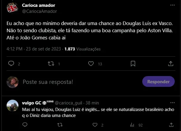 Vale destacar também que, além do ex-volante do Vasco, outros jogadores também foram lembrados nas redes sociais, como o também volante João Gomes, ex-Flamengo e que atua em uma das equipes rivais de Douglas, o Wolverhampton (ING). As ausências chamam tanta atenção que os próprios vascaínos questionaram o nome de Gerson e fizeram essas duas lembranças. Confira alguns comentários:
