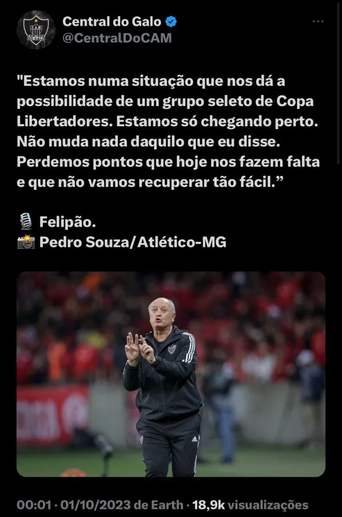 Com três pontos na mala de volta para Belo Horizonte, Felipão falou sobre as possibilidades do time na Libertadores do próximo ano. O Atlético vem disputando e sendo eliminado pelo Palmeiras há 3 anos consecutivos na fase de mata-mata, com isso, o treinador fez uma projeção, mas manteve os pés firmes no chão diante do cenário das primeiras partidas sob o seu comando.