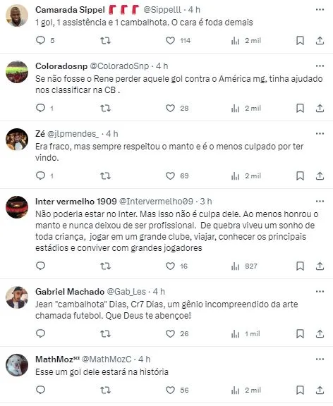 Jean Dias entrou 14 vezes em campo com o Manto Colorado, foi autor de um gol e realizou uma assistência. Seu último jogo aconteceu no distante 9 de julho, na 14ª rodada do Brasileirão, quando o Inter perdeu de 2 a 0 para o Fluminense.