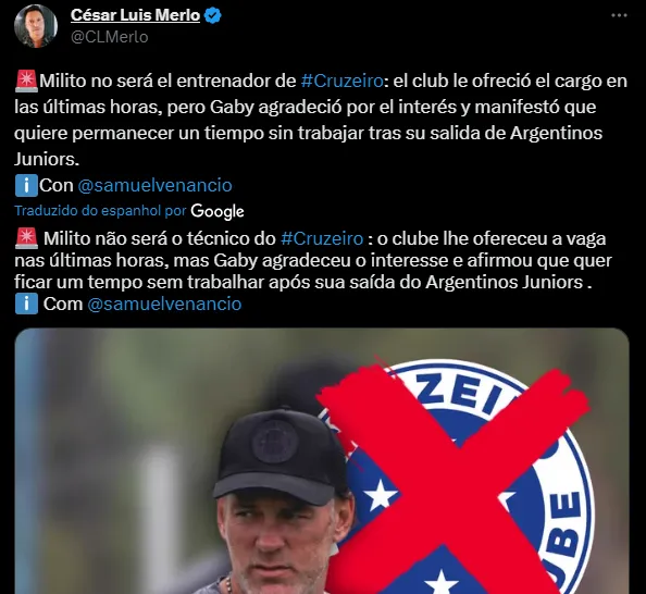 No entanto, Milito não será treinador do Cruzeiro. De acordo com o jornalista César Luis Merlo, especializado no mercado da bola, o argentino foi procurado pelo clube mineiro, mas agradeceu o interesse e afirmou que quer ficar um tempo sem trabalhar após sua saída do Argentinos Juniors. Milito deixou o time de ‘surpresa’ depois de ser eliminado na Copa da Argentina.