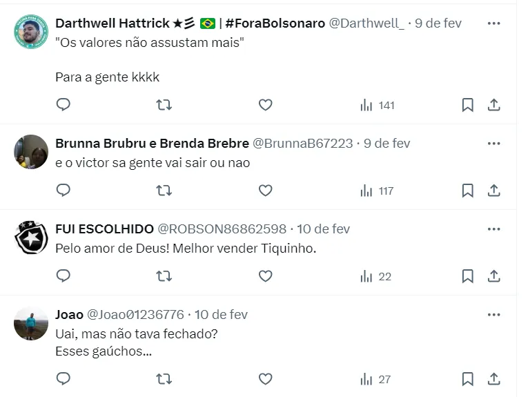 Ainda assim, a gestão segue monitorando o mercado e trabalhando buscando a qualificação do elenco. A diretoria entende que não encontrar facilidade, mas segue monitorando o mercado para atender os pedidos dos técnicos.