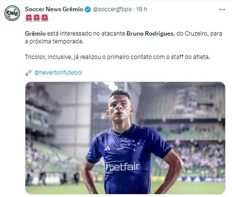A ponta esquerda do ataque do Grêmio ganhou um pretendente, trata-se de Bruno Rodrigues, jogador que atualmente está no Cruzeiro, porém, com situação indefinida, pois seu contrato com a equipe mineira vai até o final do ano.