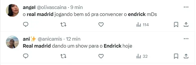 A tendência é que Endrick se apresente ao Real Madrid em julho de 2024, na primeira janela europeia após completar 18 anos. Enquanto vive a expectativa de jogar no Real Madrid, os torcedores palmeirenses já começam a sentir sua falta.