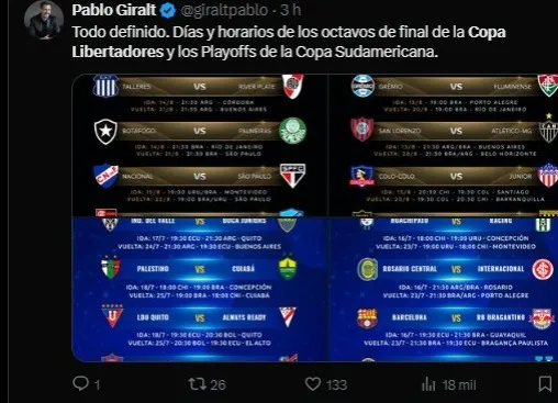 A CONMEBOL divulgou as datas e horários das partidas das oitavas de final da Libertadores da América. O destaque do foi a Arena do Grêmio como um dos estádios divulgados para realização de jogos. Vale lembrar que o tricolor informou que Arena só estaria disponível no fim do segundo semestres.