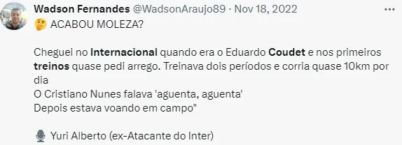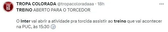 Lembrando que, o Inter voltou aos treinos na terça-feira (14) no complexo esportivo da PUCRS. O Colorado tinha ficado da sexta-feira (03) até segunda-feira (13) sem treinar.