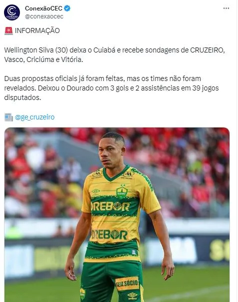 Trata-se de Wellington Silva, que acabou de encerrar seu vínculo com o Cuiabá e está livre para negociar com qualquer equipe. Além do Cruzeiro, Criciúma, Vitória e Vasco, que acaba de assinar com o badalado diretor Alexandre Mattos, também demonstraram interesse. O portal citado, inclusive, afirma que duas ofertas foram feitas, mas não revelou qual dos quatro Clubes avançaram pelo jogador.