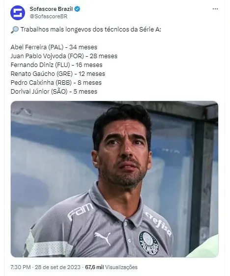 Resistindo e com motivos de sobra, Abel Ferreira é o treinador com o trabalho mais longevo do futebol brasileiro. O português está à frente do Verdão há 34 meses, ou seja, há quase três anos. Em sequência, vem o trabalho de Juan Pablo Vojvoda, que está no comando do Fortaleza por 28 meses. Depois, Fernando Diniz assume a 3ª posição, com 16 meses, pouco mais de um ano.