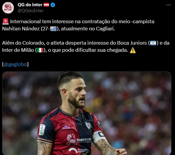 Vivendo ano eleitoral, o Colorado toma cuidado em possíveis chegadas e saídas. Além de Gustavo Scarpa e Bruno Rodrigues, outro jogador interessa: o meio-campista Nahitan Nández, de 27 anos, que atualmente joga no Cagliari, da Itália.