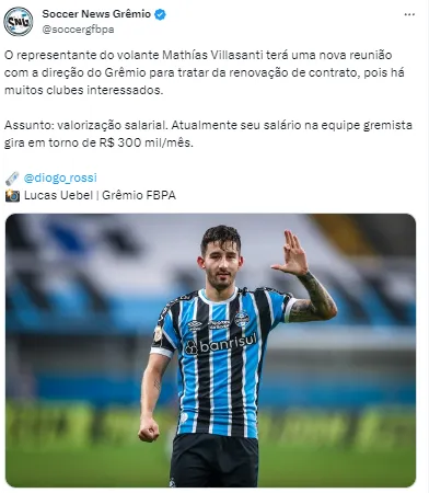 “O representante do volante Mathías Villasanti terá uma nova reunião com a direção do Grêmio para tratar da renovação de contrato, pois há muitos clubes interessados. Assunto: valorização salarial. Atualmente seu salário na equipe gremista gira em torno de R$ 300 mil/mês”, informou Rossi.