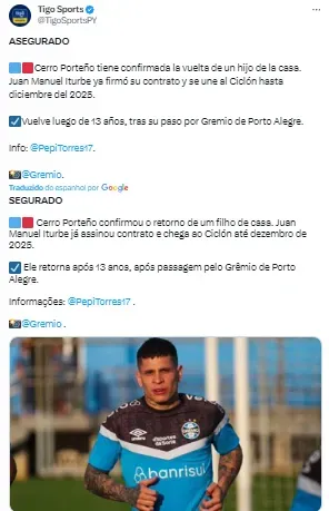 “Cerro Porteño confirmou o retorno de um filho de casa. Juan Manuel Iturbe já assinou contrato e chega até dezembro de 2025. Ele retorna após 13 anos, após passagem pelo Grêmio de Porto Alegre”, informou Pedro Torres.