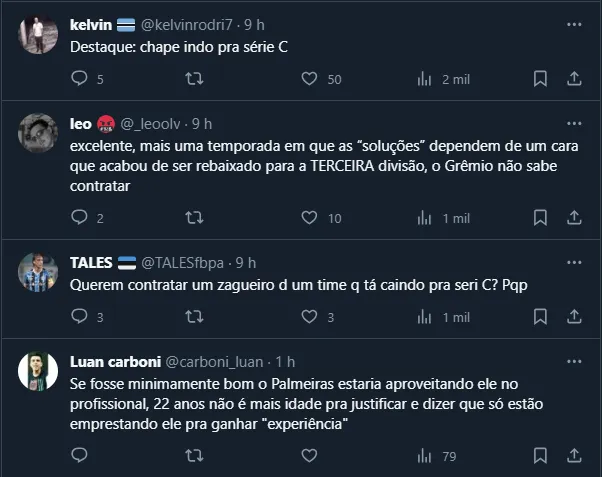 Mesmo assim, como está vestindo a camisa de uma equipe que luta para não cair para a Série C, os torcedores do Grêmio não ficaram tão satisfeitos com o nome. Não à toa, “choveram” críticas nas redes sociais.
