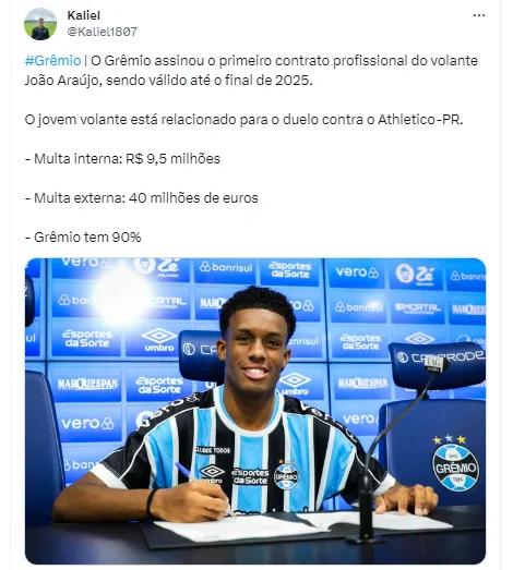 “O Grêmio assinou o primeiro contrato profissional do volante João Araújo, sendo válido até o final de 2025. O jovem volante está relacionado para o duelo contra o Athletico-PR. – Multa interna: R$ 9,5 milhões. Multa externa: 40 milhões de euros (R$ 212 milhões na cotação atual). Grêmio tem 90% dos direitos econômicos”, publicou Kaliel em suas redes sociais.
