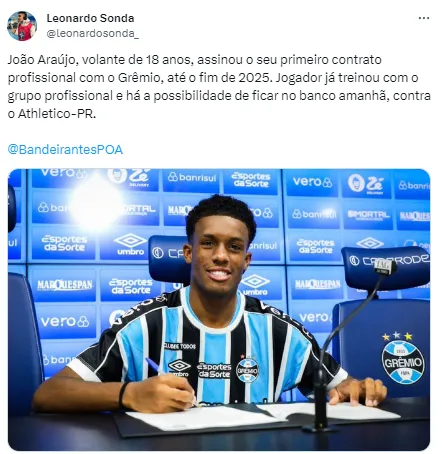 “João Araújo, volante de 18 anos, assinou o seu primeiro contrato profissional com o Grêmio, até o fim de 2025. Jogador já treinou com o grupo profissional e há a possibilidade de ficar no banco amanhã, contra o Athletico-PR”, relatou Leonardo Sonda, da Rádio Bandeirantes, de Porto Alegre.