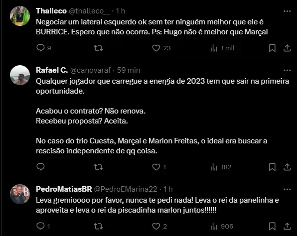 O Botafogo aguarda um movimento mais ‘oficial’ por parte do Grêmio, que estuda uma melhor oferta para Marçal e também ao Glorioso. O lateral tem contrato com o Fogão até o final de 2024, ou seja, em junho já pode assinar um pré-contrato com qualquer equipe.