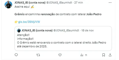 Conforme informações apuradas em primeira mão pelo jornalista Jeremias Werneck, do site GZH, e confirmadas pelo GE, o lateral-direito João Pedro, de 27 anos, está muito próximo de ter seu contrato renovado. O acordo dele deve ir até 2025.