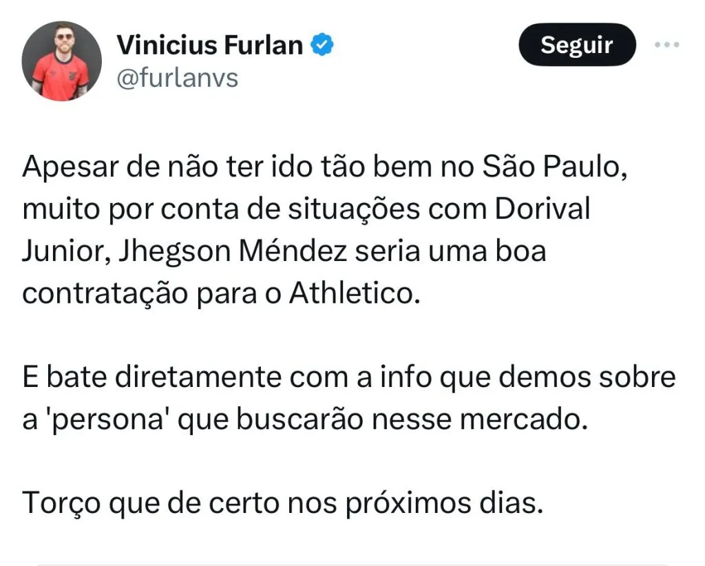 Segundo o jornalista Gabriel Sá, o Athletico Paranaense consultou o São Paulo nos últimos dias sobre a situação de Jhegson Méndez A ideia do bate-papo era apenas para entender valores e apresentar uma proposta pelo volante equatoriano.