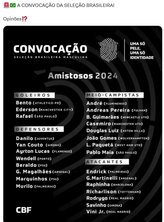 Usando como base a primeira convocação de Dorival Jr. para a Seleção Brasileira, diversos internautas pediram para que o ex-treinador do São Paulo Futebol Clube escalasse alguns jogadores como titulares.