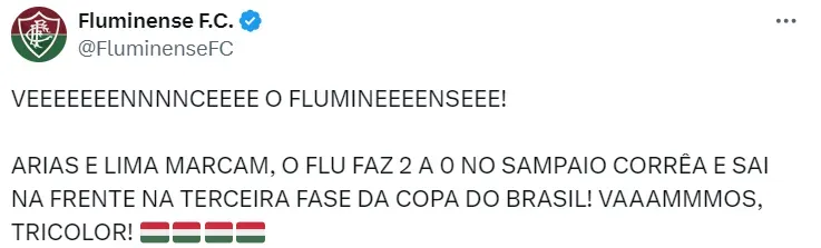 Nesta quarta-feira (1), o Fluminense fez a sua estreia na Copa do Brasil. Pelo jogo de ida da terceira fase, a equipe venceu o Sampaio Corrêa, por 2 a 0, em Cariacica (ES).