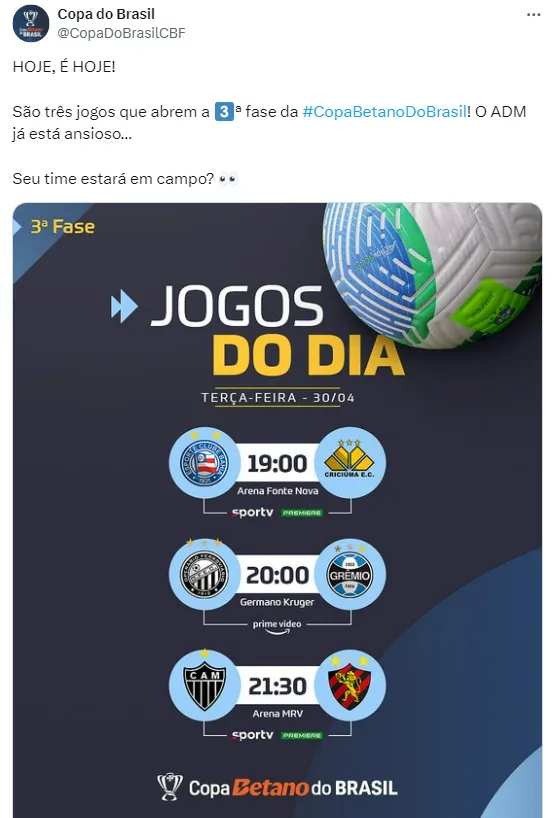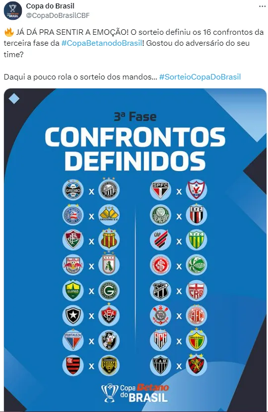 Com 32 times em busca do título, a Copa do Brasil 2024 começa a sua terceira fase nesta terça-feira (30). Ao todo, 16 confrontos movimentarão essa fase da competição.