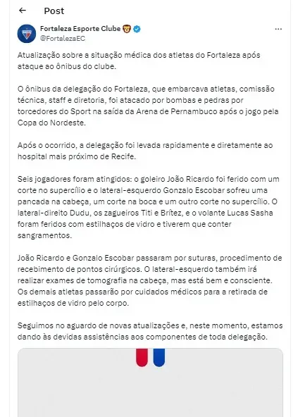 “Todos se feriram, estilhaços de vidro, e Escobar um pouco mais, só fez uma sutura, mas a informação que a gente tem é que ele está bem, sendo tratado, medicado, estão bem, mas poderia ser uma tragédia muito grave. Porque foi uma bomba atirada contra o ônibus. E isso não pode acontecer, achar que é normal, acho que tem que se verificar como um todo o porquê disso estar acontecendo no Brasil”, disse o comandante do Fortaleza.