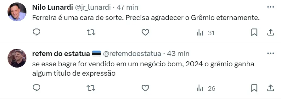 Com isso, o destino de Ferreirinha pode ficar entre São Paulo e Corinthians para o ano que vem. O Tricolor Gaúcho espera fazer negócio para não perder o atacante de 25 anos de graça ao fim do contrato.