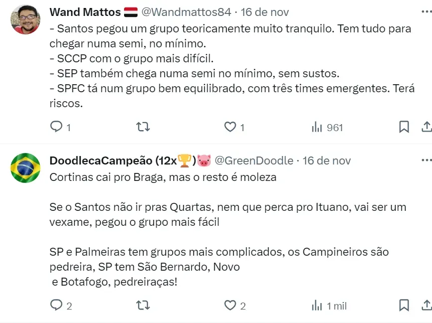 O Palmeiras, por sua vez, está no Grupo B, com Guarani, Ponte Preta e Água Santa. Já o São Paulo, aparece no Grupo C, ao lado de Novorizontino, São Bernardo e Botafogo-SP.