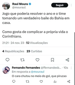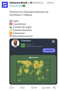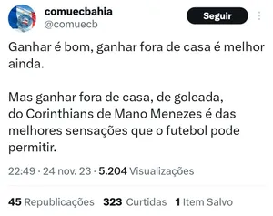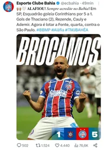 O Bahia surpreendeu na noite desta sexta-feira ao golear o Corinthians por 5 a 1, em uma partida em que impôs pressão do primeiro ao último minuto. Os autores dos gols tricolores foram Rezende, Cauly, Thaciano (2x), Ademir. Renato Augusto marcou para o Timão
