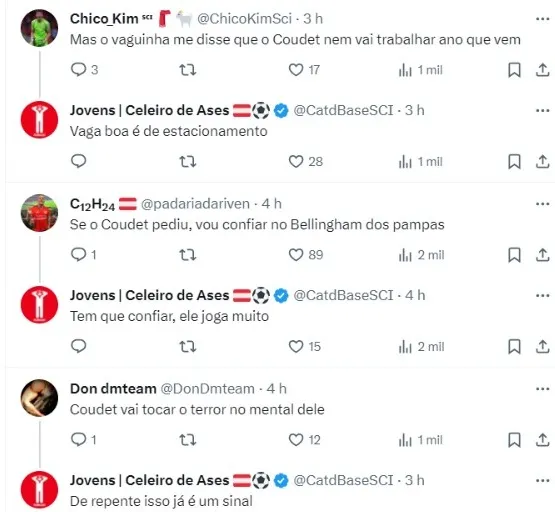 “Coudet faz pedido especial para Matheus Dias não deixar o clube e promete oportunidades para o meio-campista. A cria do Celeiro conta com a admiração de Chacho, que quer transformá-lo na próxima grande venda do Inter”, disse o jornalista Alexandre Ernst, do Vozes do Gigante.