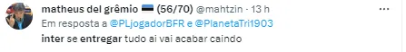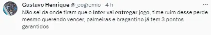 Em entrevista pós-jogo, o treinador do Inter, Eduardo Coudet, se manifestou sobre essa polêmica e afirmou que o Colorado não irá entregar jogos para os adversários diretos do Grêmio pelo título do Brasileirão.