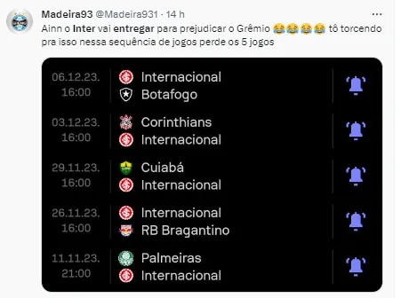 Com isso, já começou a surgir uma movimentação de alguns colorados para que o Internacional entregue os jogos para esses adversários para prejudicar o Tricolor Gaúcho. Porém, Coudet já se pronunciou sobre e o assunto chegou ao Grêmio.