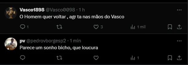 Todavia, o que deixa o torcedor animado é a confirmação de conversas para um novo ciclo no Vasco: “a única coisa que consigo falar é que existem conversas, é verdade. E o que falei em São Paulo sabem a minha vontade, isso todo mundo já sabe“, confirmou o próprio meio-campista aos jornalistas presentes.