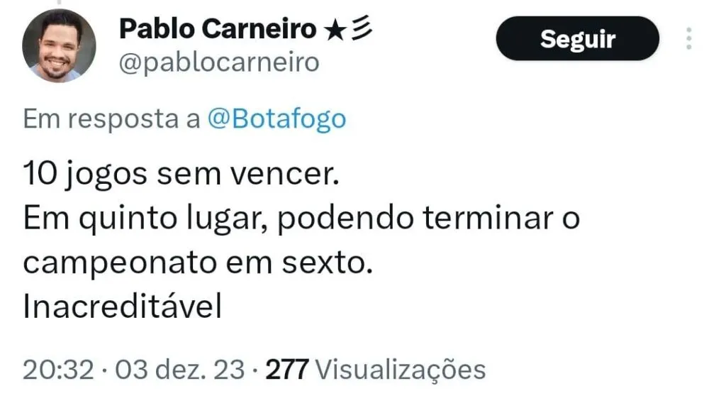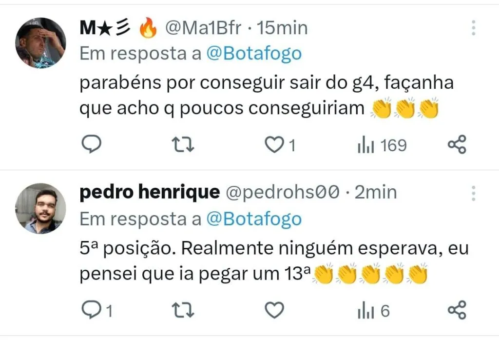A hastag “Parabéns Botafogo” ficou em alta no ‘X’, antigo Twitter, e contou com diversos memes e provocações de torcedores rivais que satirizaram a ‘pipocada’ do Glorioso no Brasileirão. Vale lembrar que derrocada repercutiu na imprensa internacional.