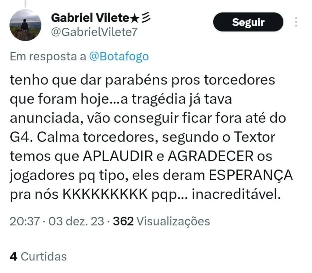 “100min dolorosos, de um Botafogo covarde, pavoroso e digno de pena. Esse elenco vai com tudo para perder a vaga no G4 na última rodada e pelo visto, vai conseguir. Ridículo. Muito ridículo.”, postou um torcedor, antes da definição do resultado do Grêmio que empurrou a equipe para fora do G-4.
