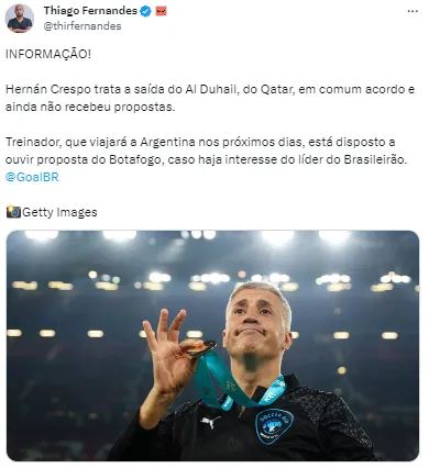 “Hernán Crespo trata a saída do Al Duhail, do Qatar, em comum acordo e ainda não recebeu propostas. Treinador, que viajará a Argentina nos próximos dias, está disposto a ouvir proposta do Botafogo, caso haja interesse do líder do Brasileirão”, publicou o jornalista Thiago Fernandes em suas redes sociais sobre o desejo do treinador argentino após deixar o time árabe.