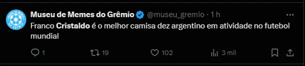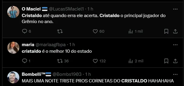 O Cristaldo só tem duas valências como jogador de futebol: fazer gol ou dar assistência“. “É impressionante, até quando erra ele acerta. Ele é o principal jogador do Grêmio do ano“, foram dois comentários publicados após o argentino balançar as redes.